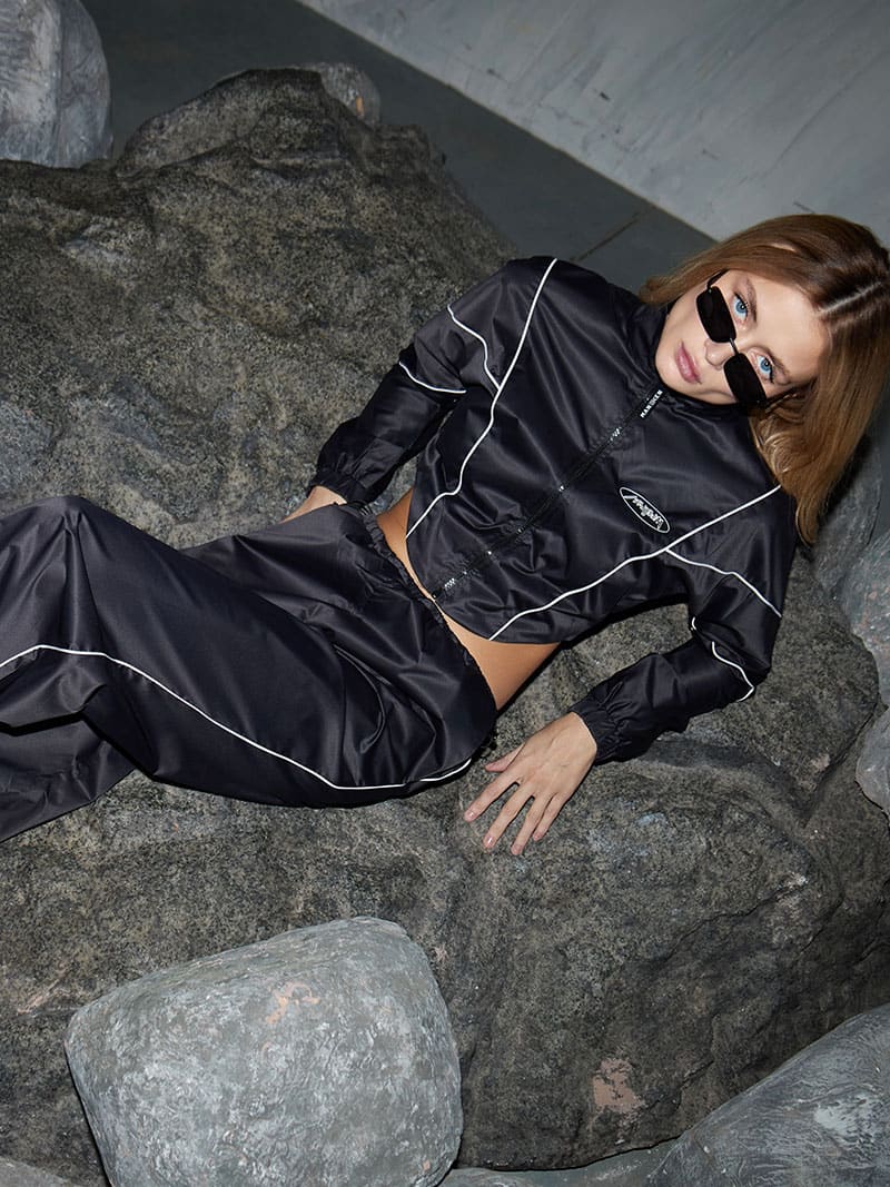 По всей ветровке в рельефах контрастный кант, подчеркивающий линии, которые визуально делают фигуру стройной.