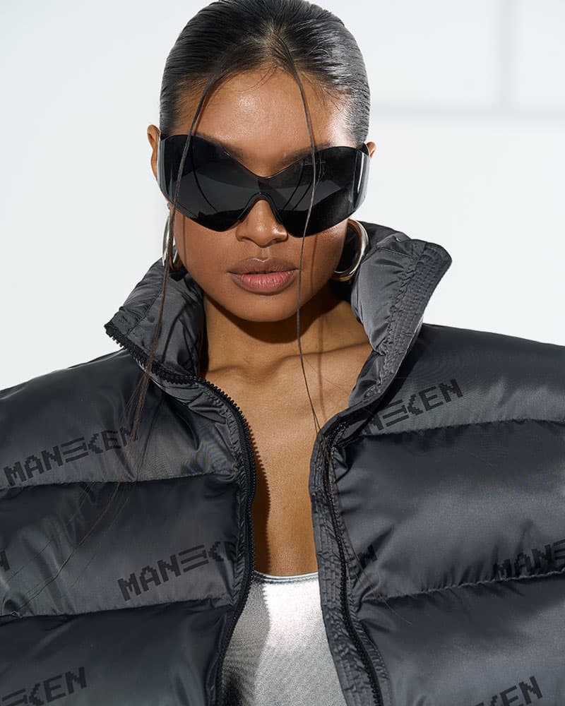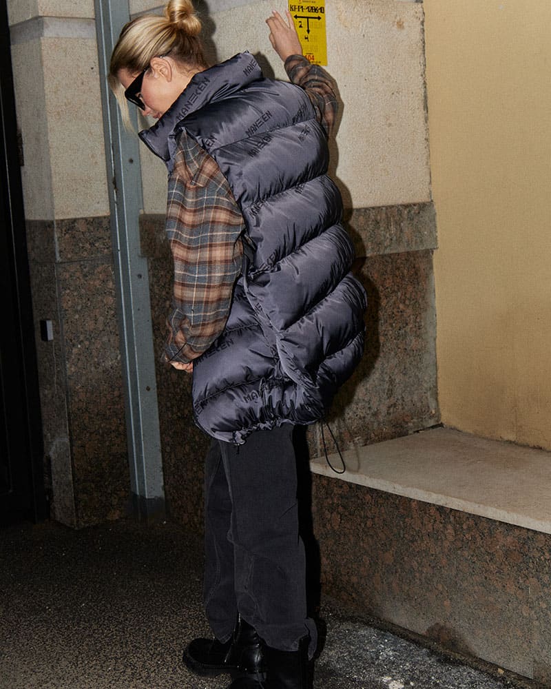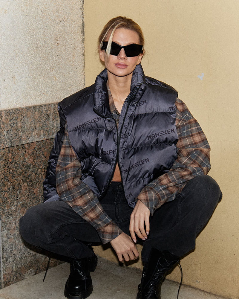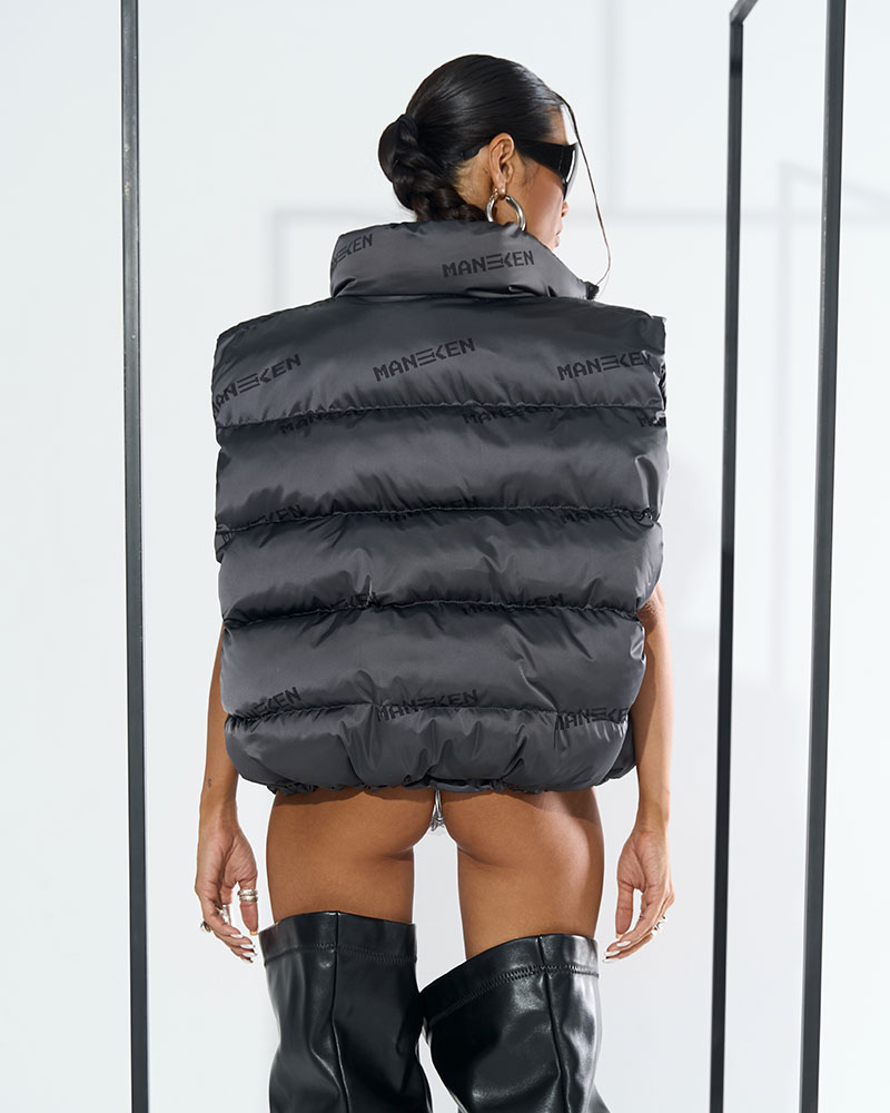 Объёмная удлинённая жилетка со стойкой. Модель прямого силуэта с лёгкой пышной набивкой на резинке с фиксаторами по низу изделия.