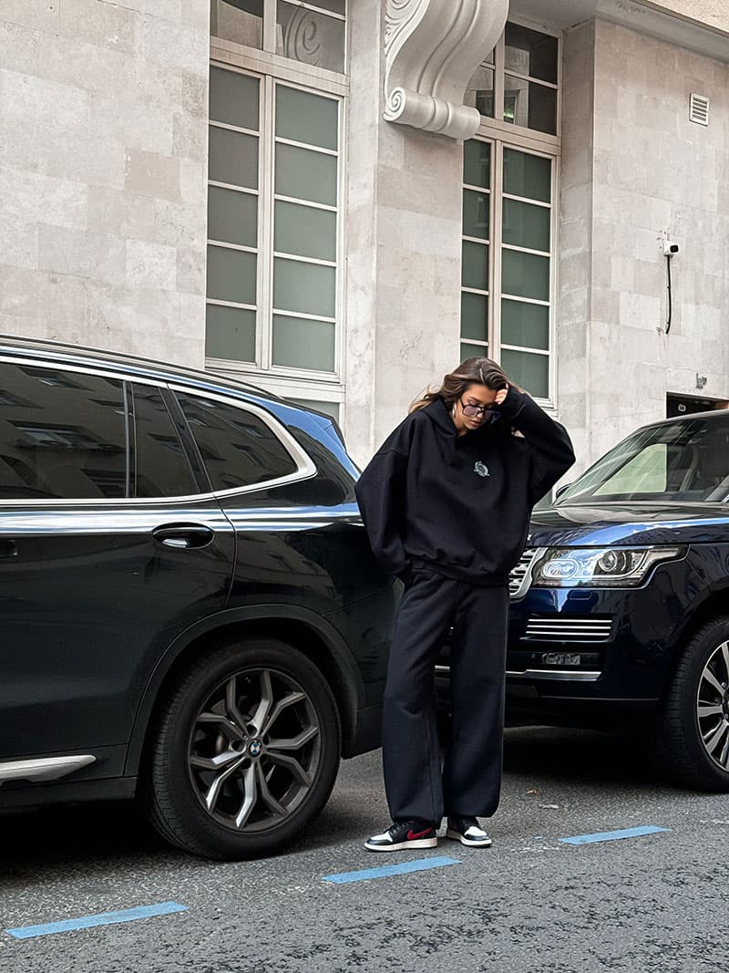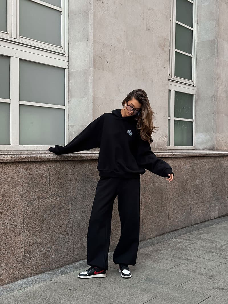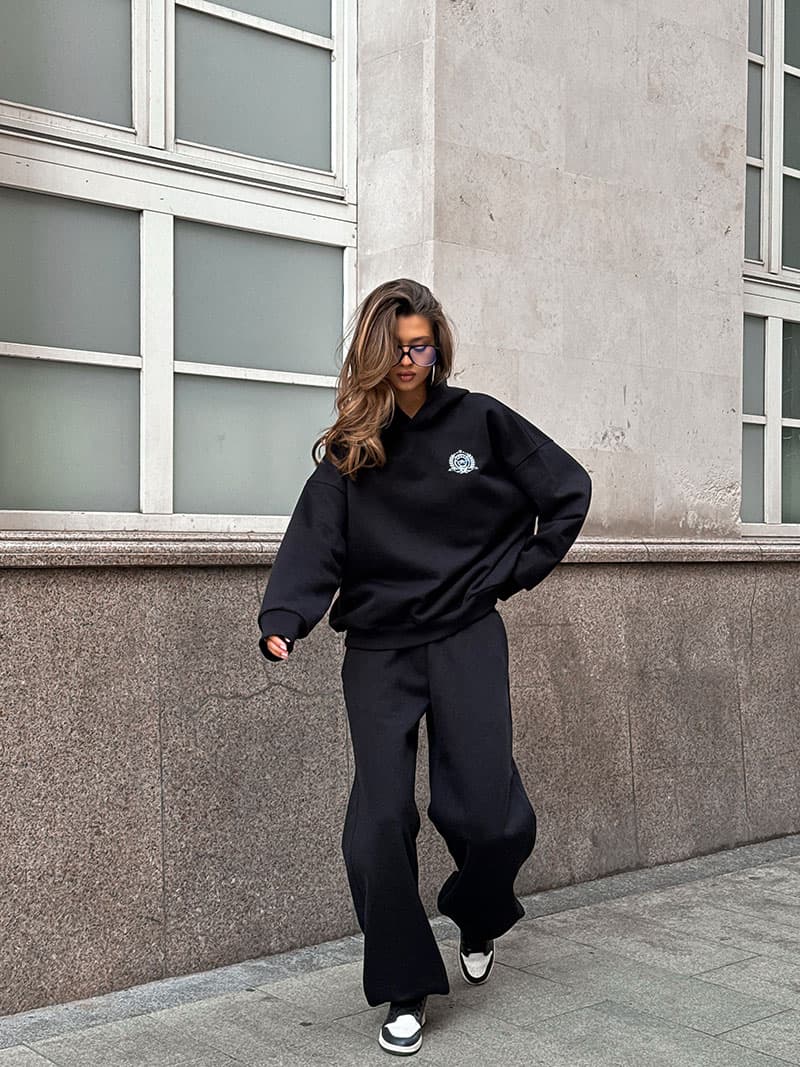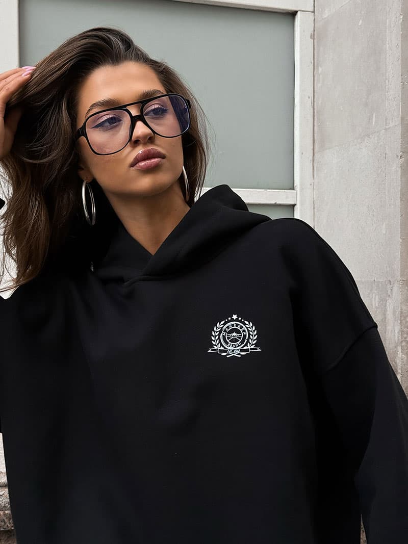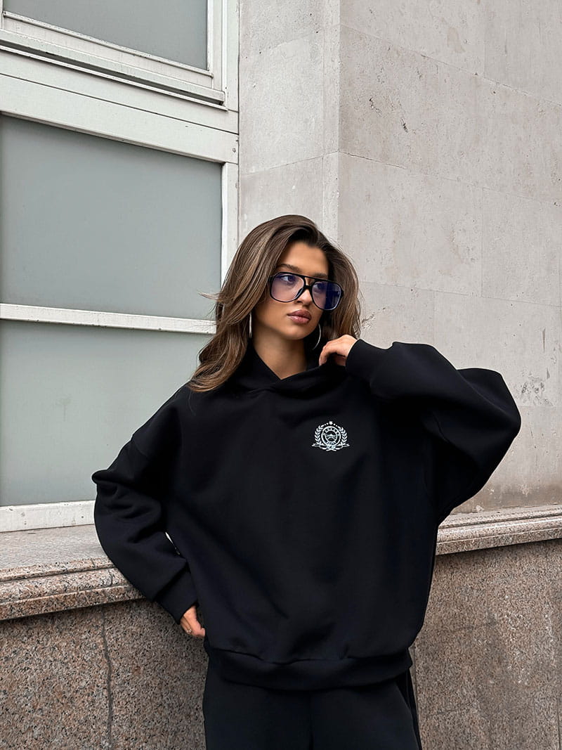 Минималистичное худи умеренного объема со спущенным рукавом и с лаконичным принтом.
