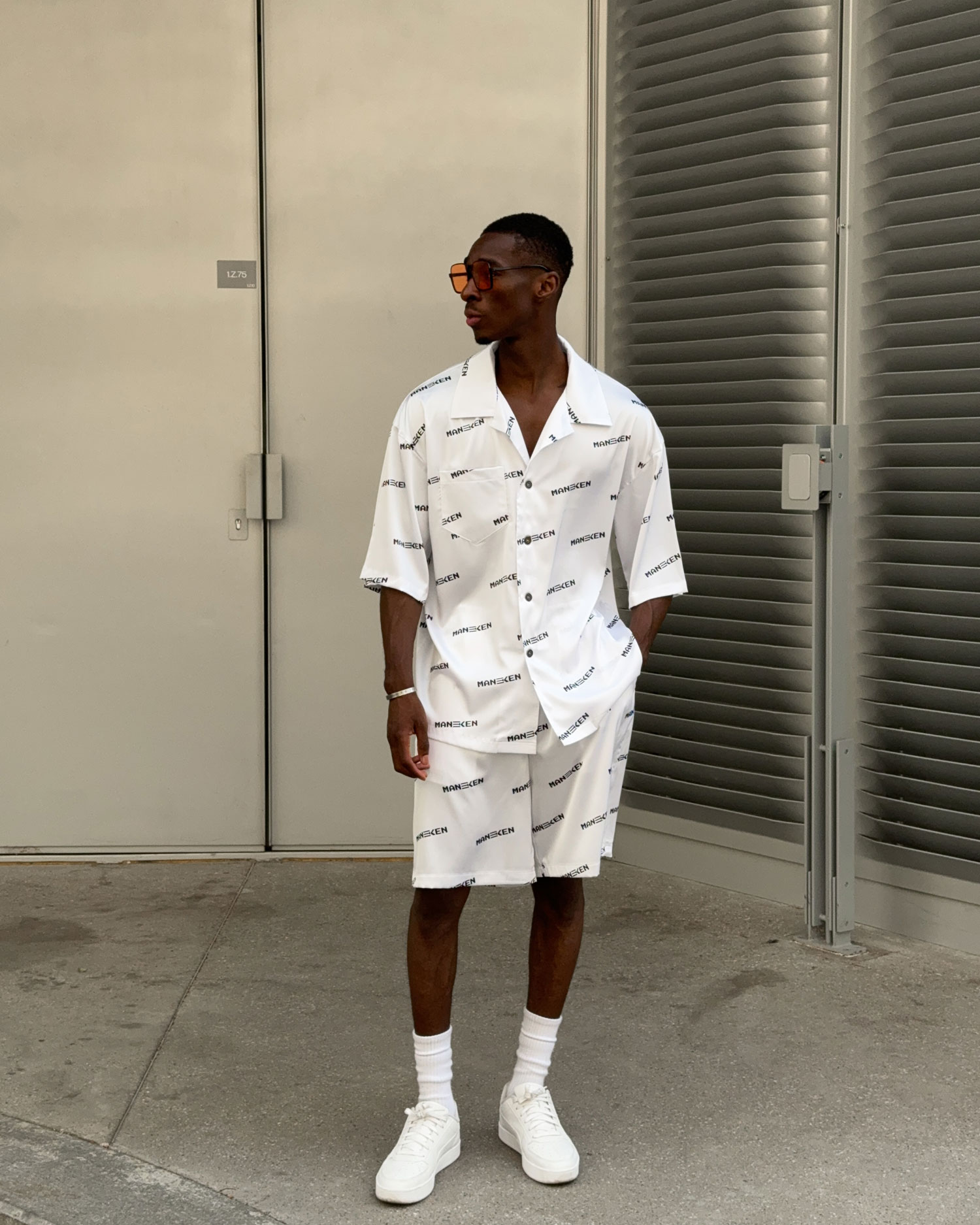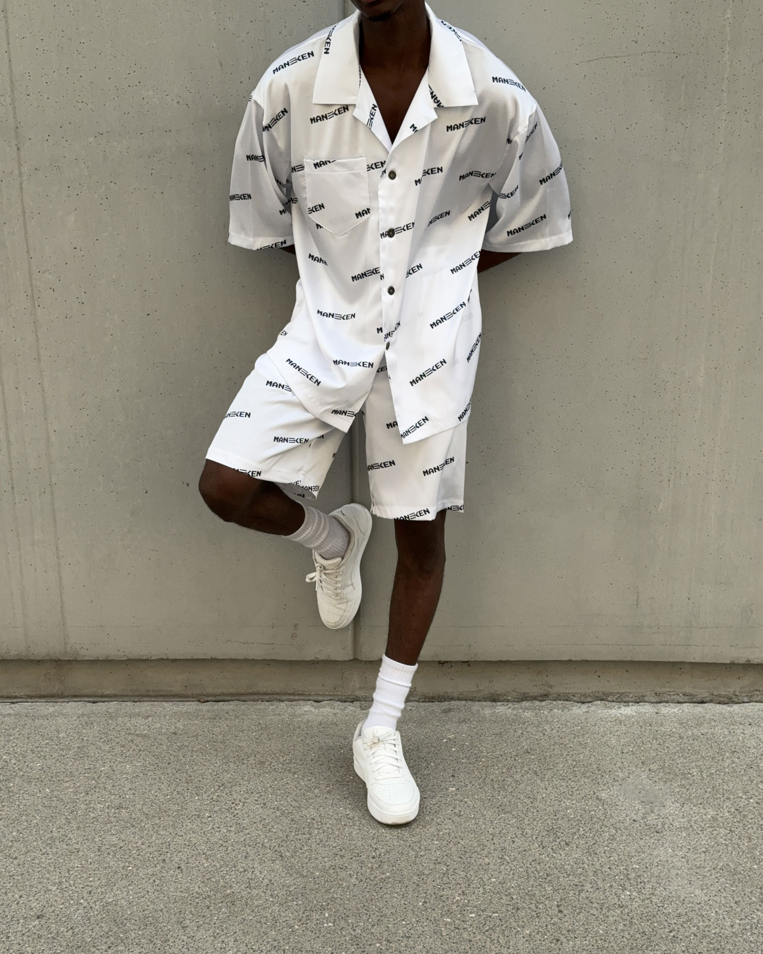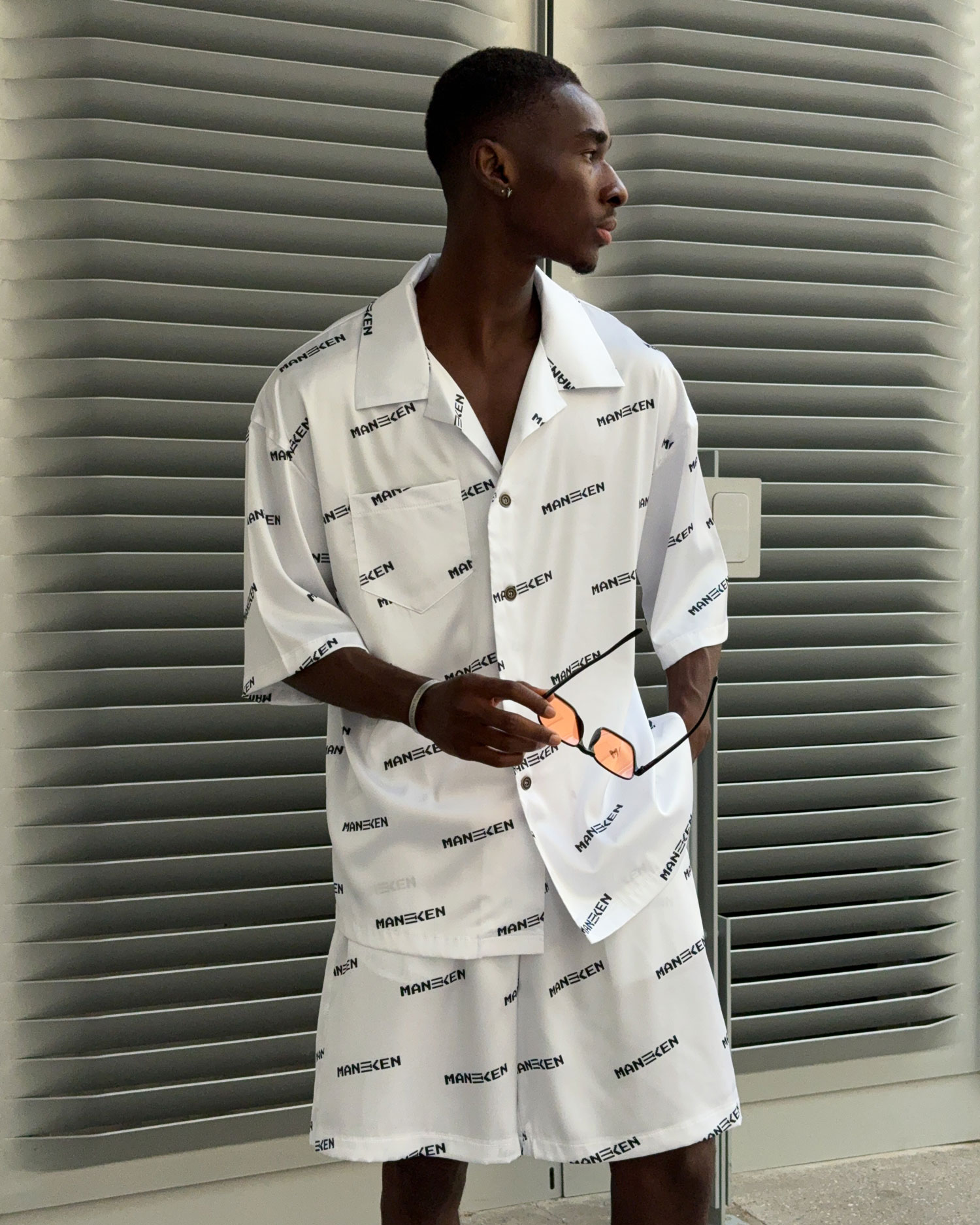 Брендированный мужской костюм из шелка: рубашка с коротким рукавом и шорты.
