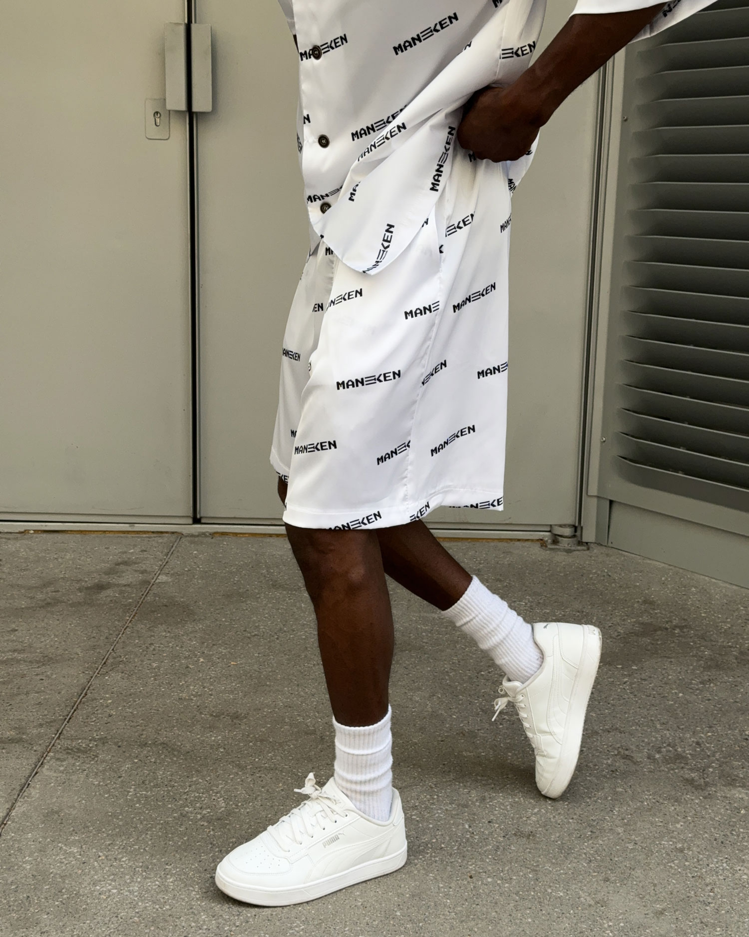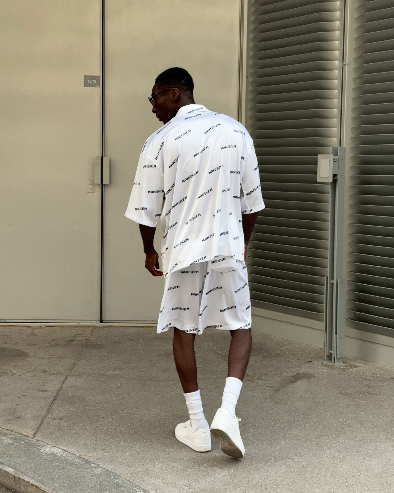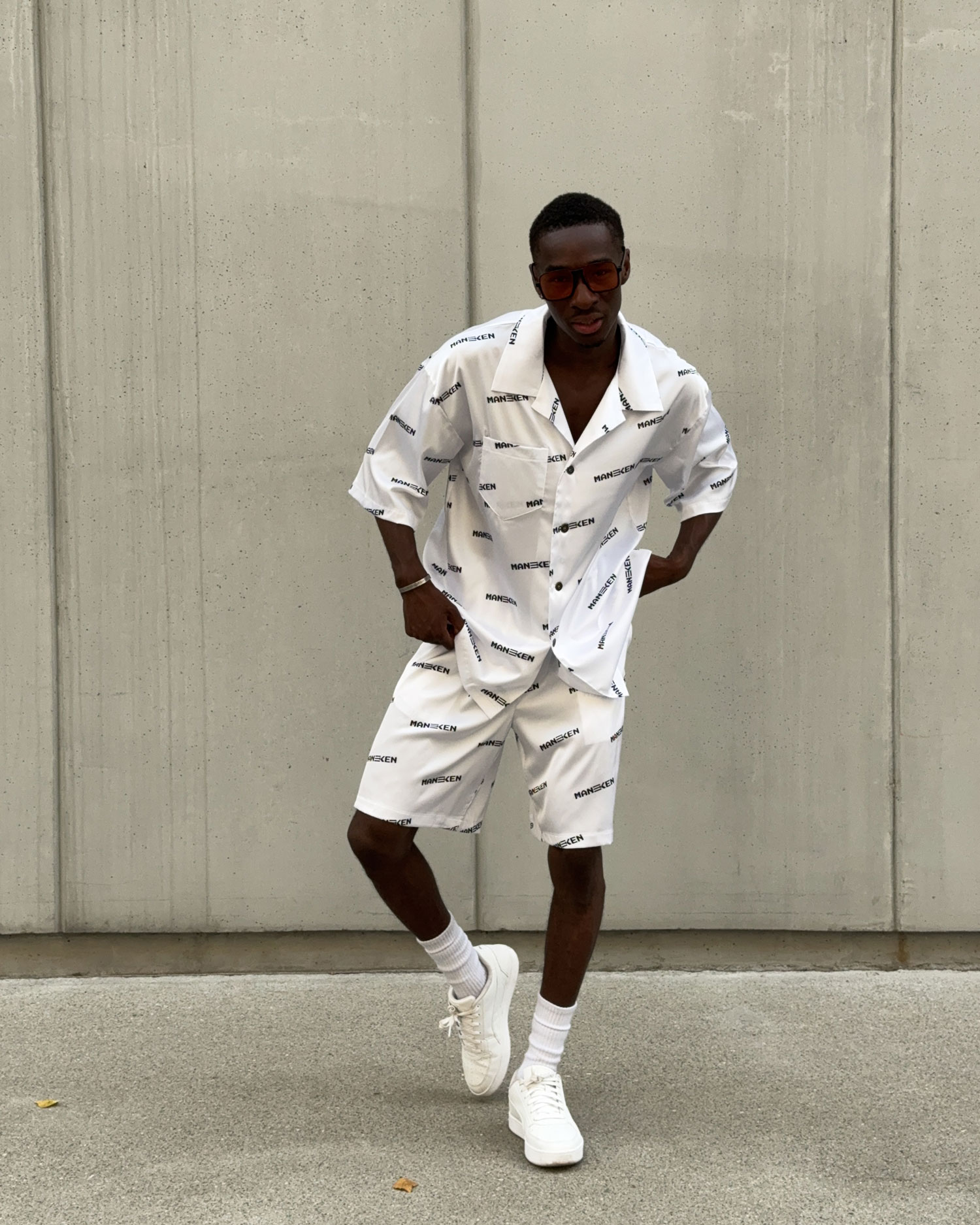 Брендированный мужской костюм из шелка: рубашка с коротким рукавом и шорты.