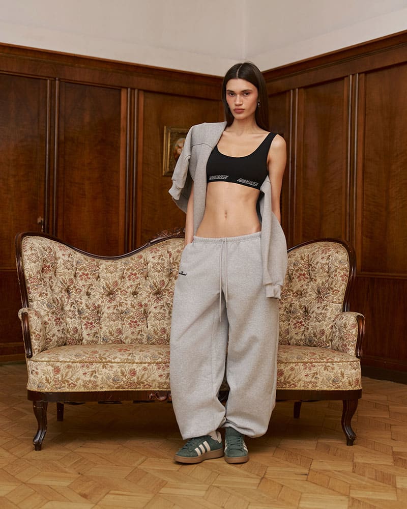 Брюки на низкой посадке с широкими брючинами. По низу имеются фиксаторы и тонкая резинка, что позволяет затягивать брючины и создавать удобный и комфортный образ в зависимости от настроения и желаемого силуэта.