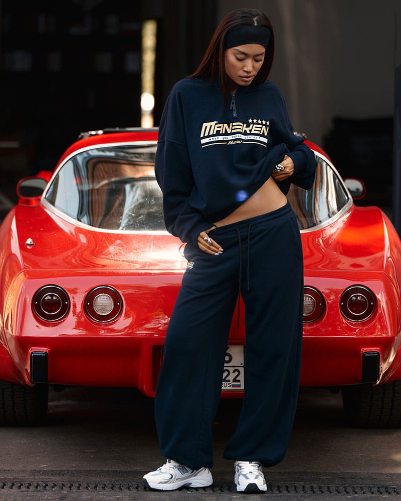 Женский костюм из мягкого футера — это сочетание уюта, стиля и функциональности. Он состоит из тройера и свободных брюк на узком поясе со шнурками, создавая идеальный баланс между спортивной эстетикой и повседневной элегантностью.