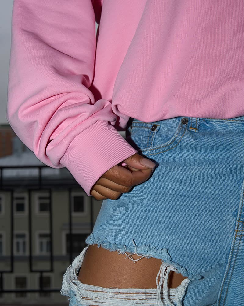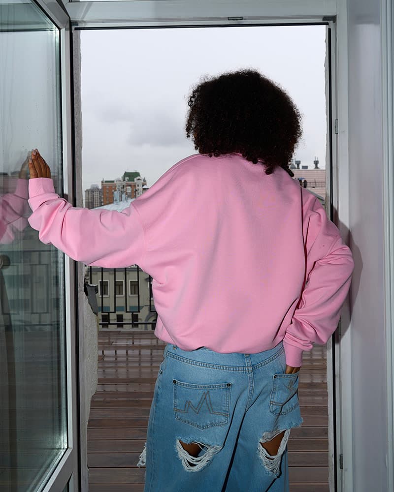 Особенностью свитшота является резинка по низу, которая создает эффект "облачка" и формирует нежные, мягкие складки, добавляя образу воздушности и легкости.