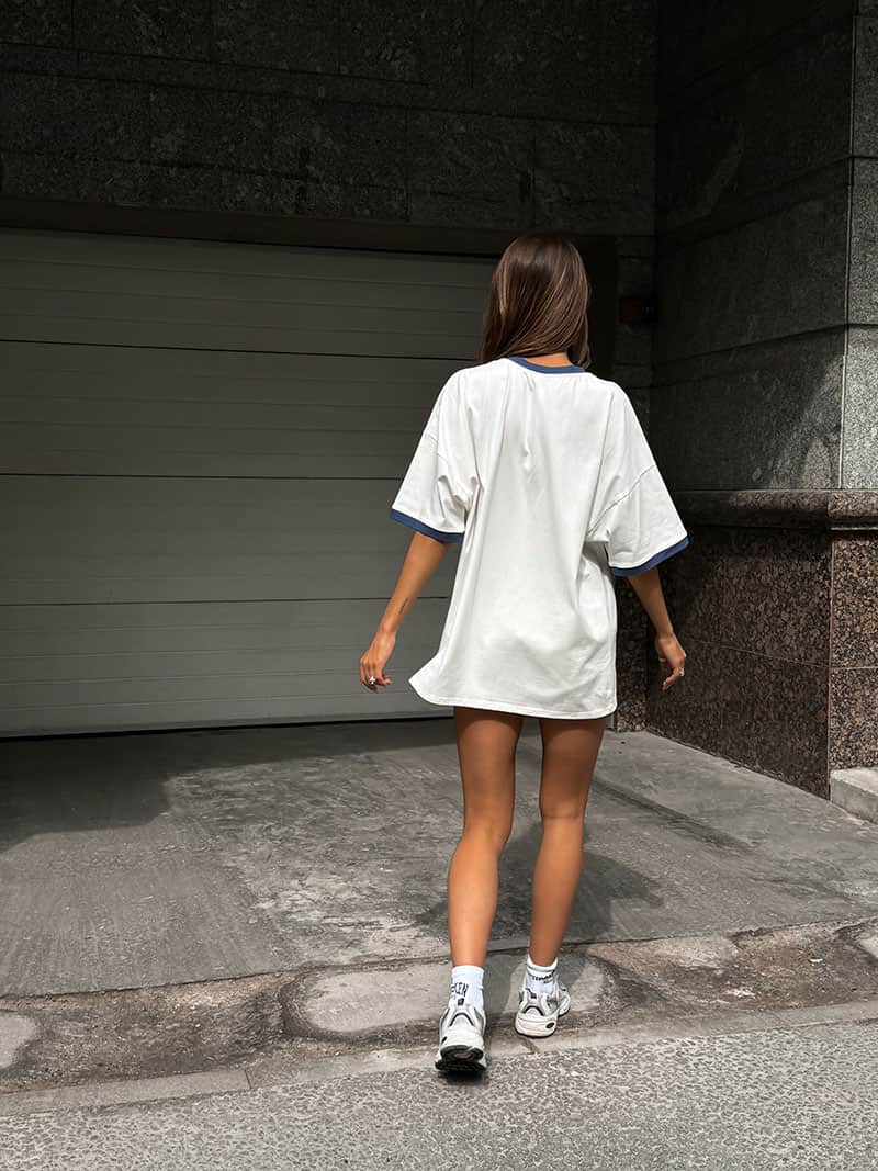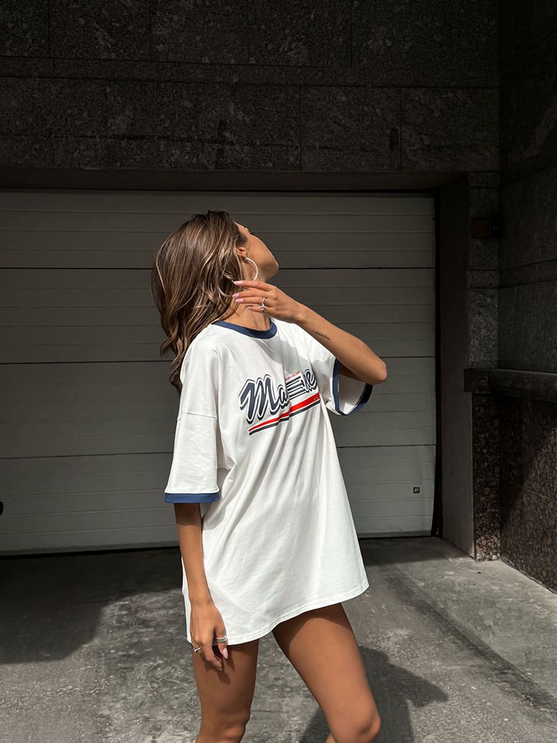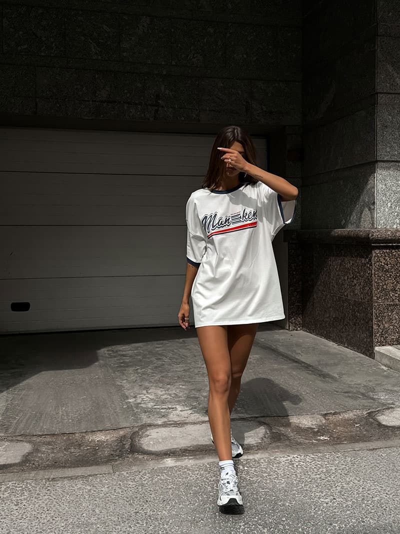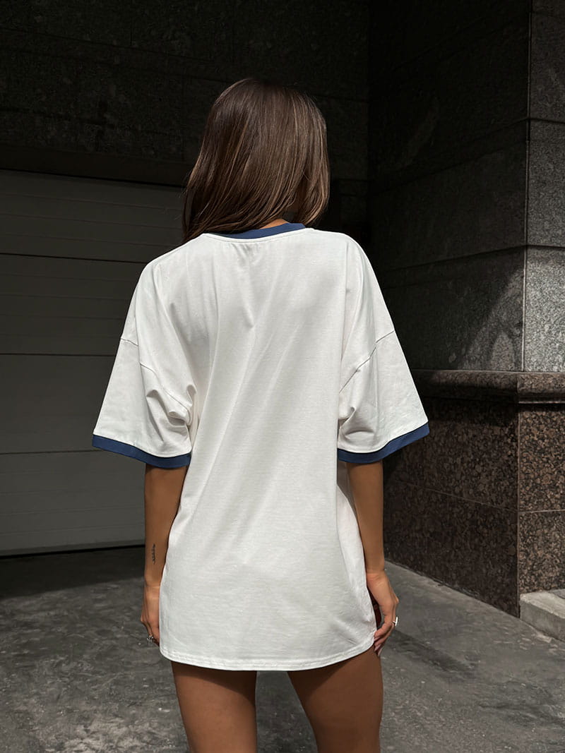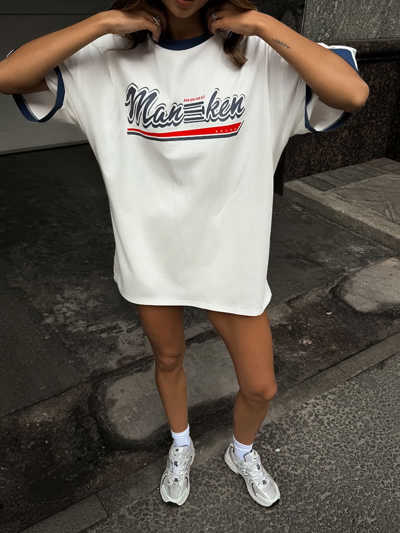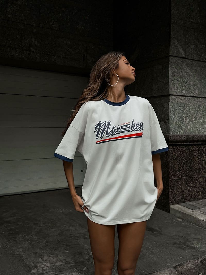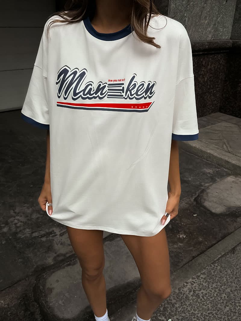 Наш фирменный адаптированный oversize в винтажном стиле с принтом. Выполнена по мотивам фильмов американских колледжей, контрастные манжеты по низу рукава футболки и горловине подчеркивают и освежают образ.
