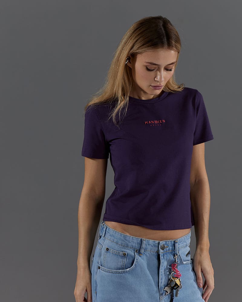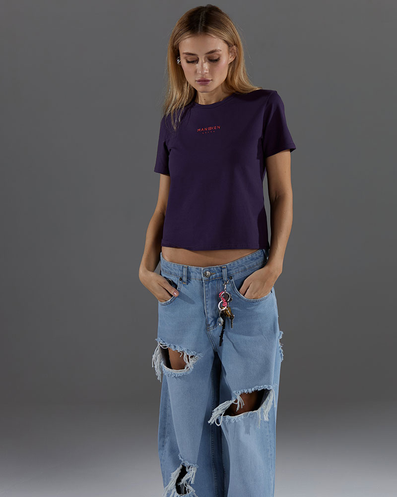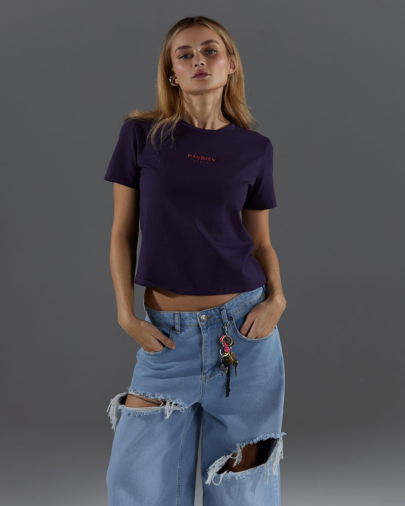 Приталенная малообъёмная укороченная по длине футболка, для создания более классических образов под объёмные низы.