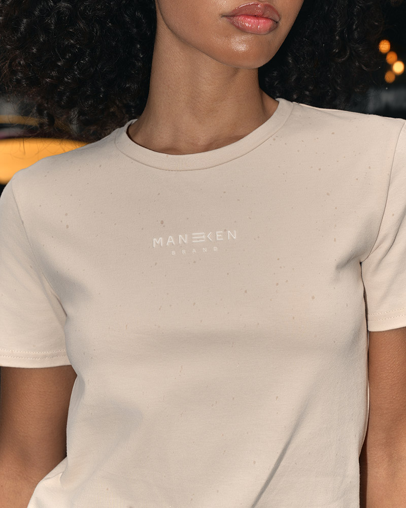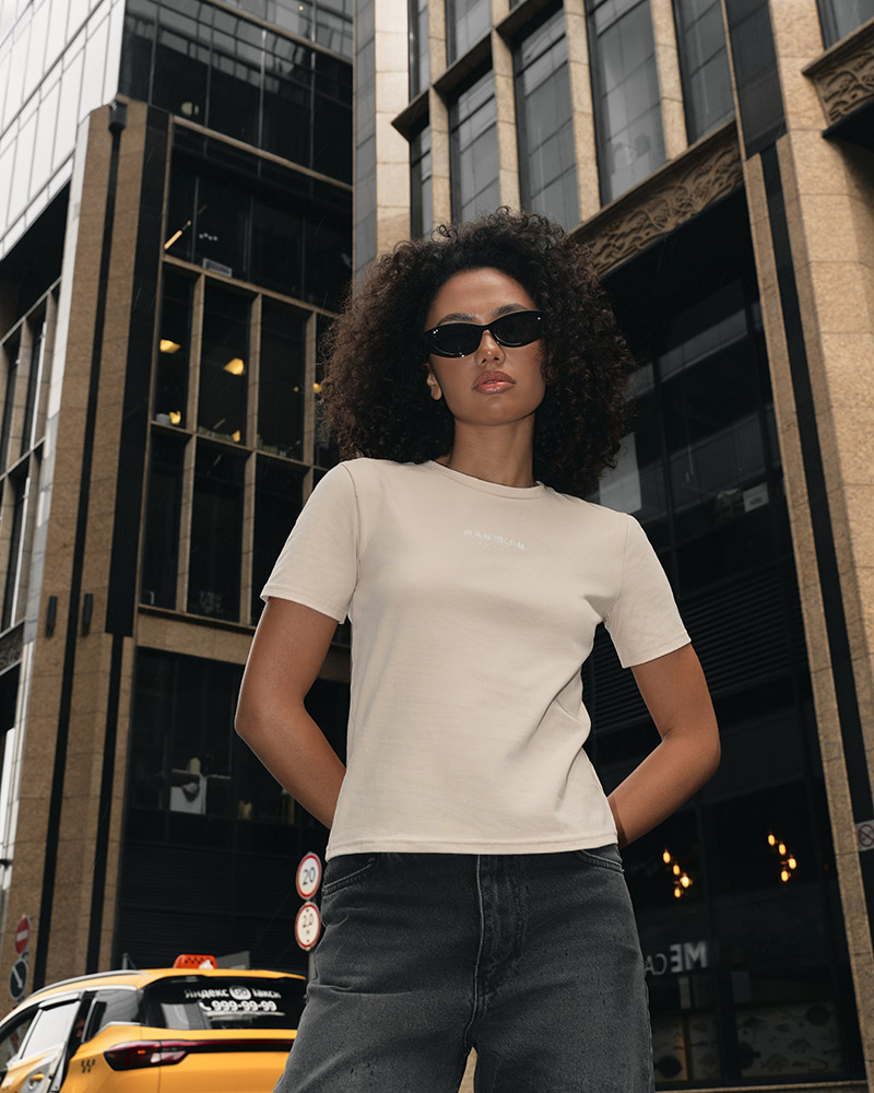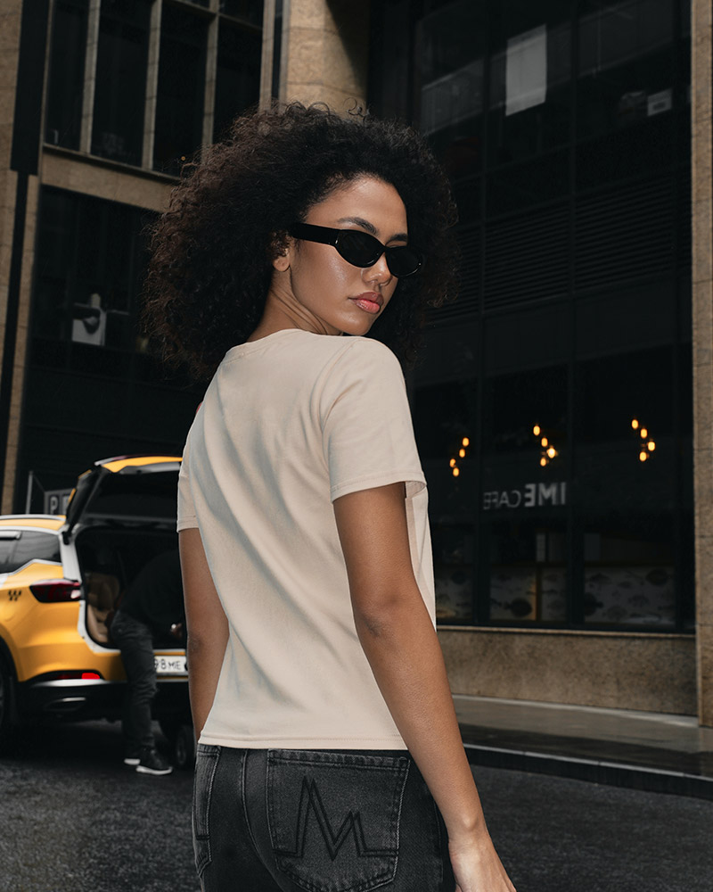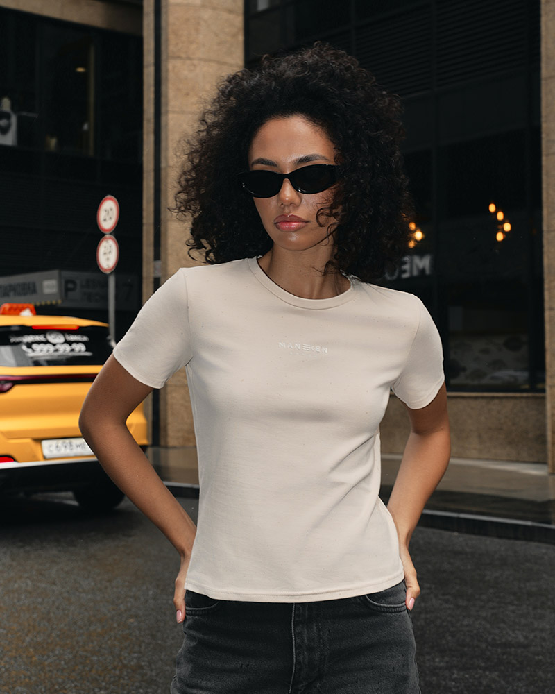 Приталенная малообъёмная укороченная по длине футболка с пич-эффектом, для создания более классических образов под объёмные низы.