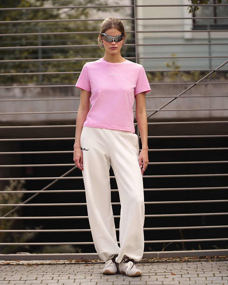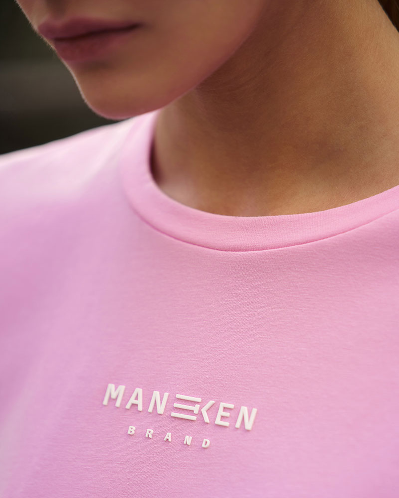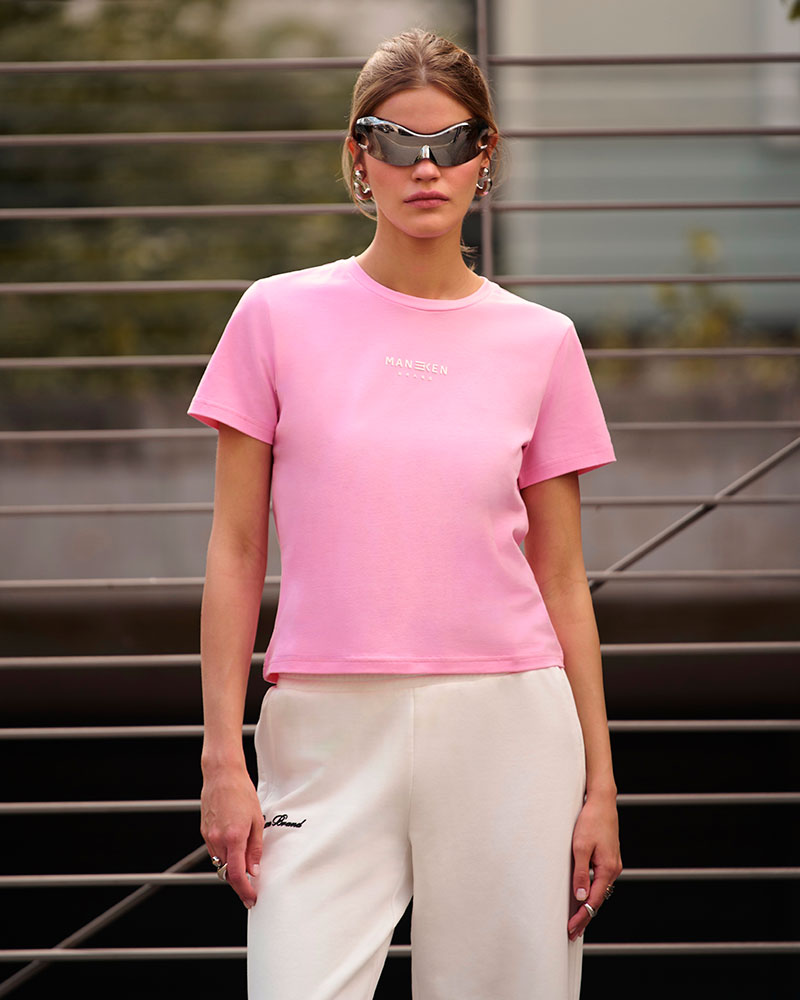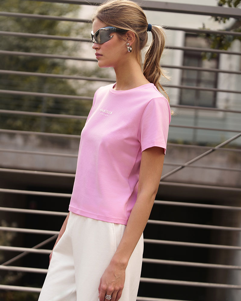 Приталенная малообъёмная укороченная по длине футболка, для создания более классических образов под объёмные низы.
