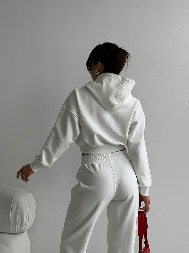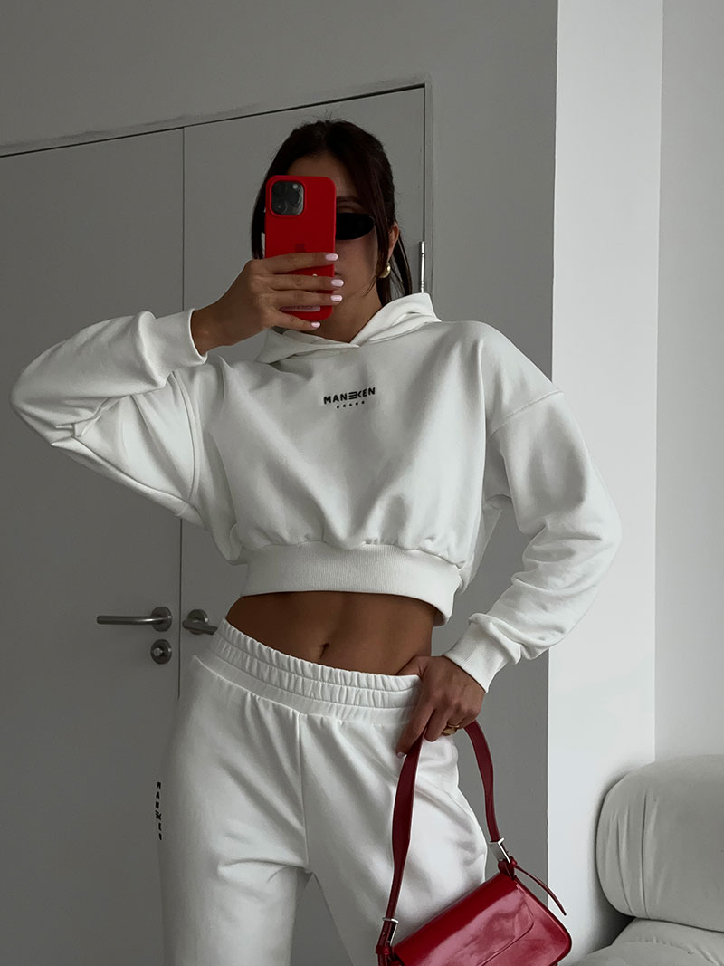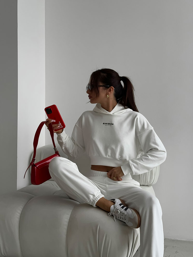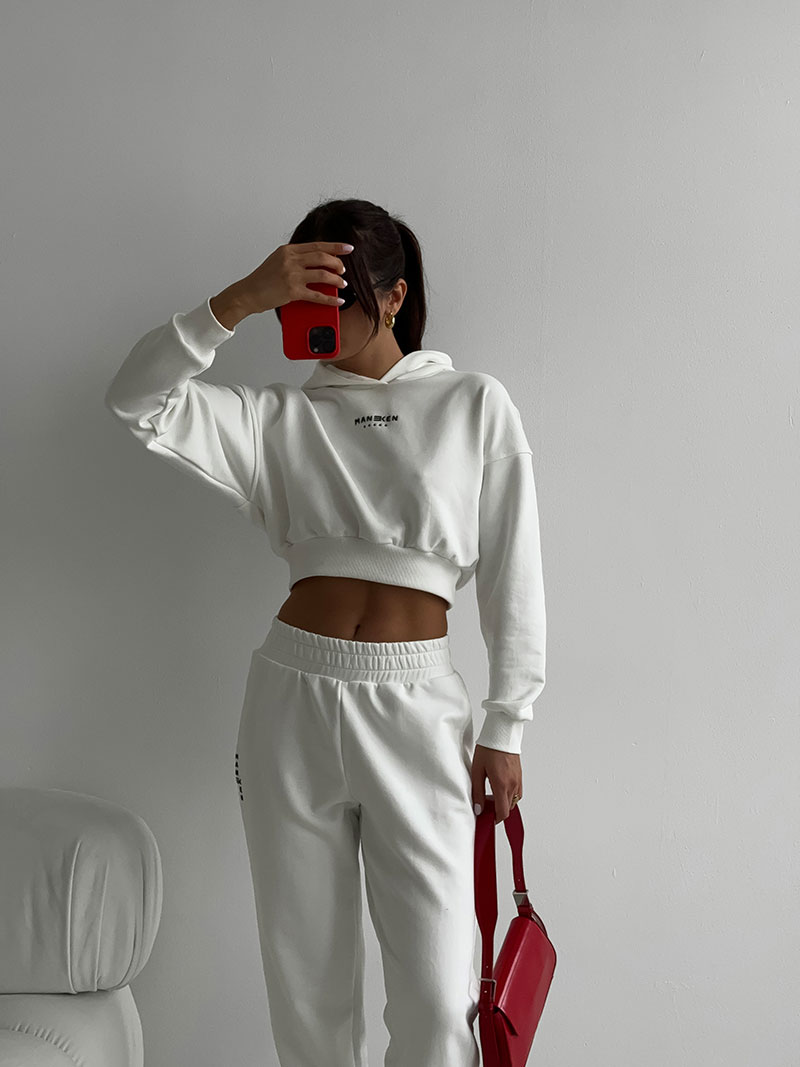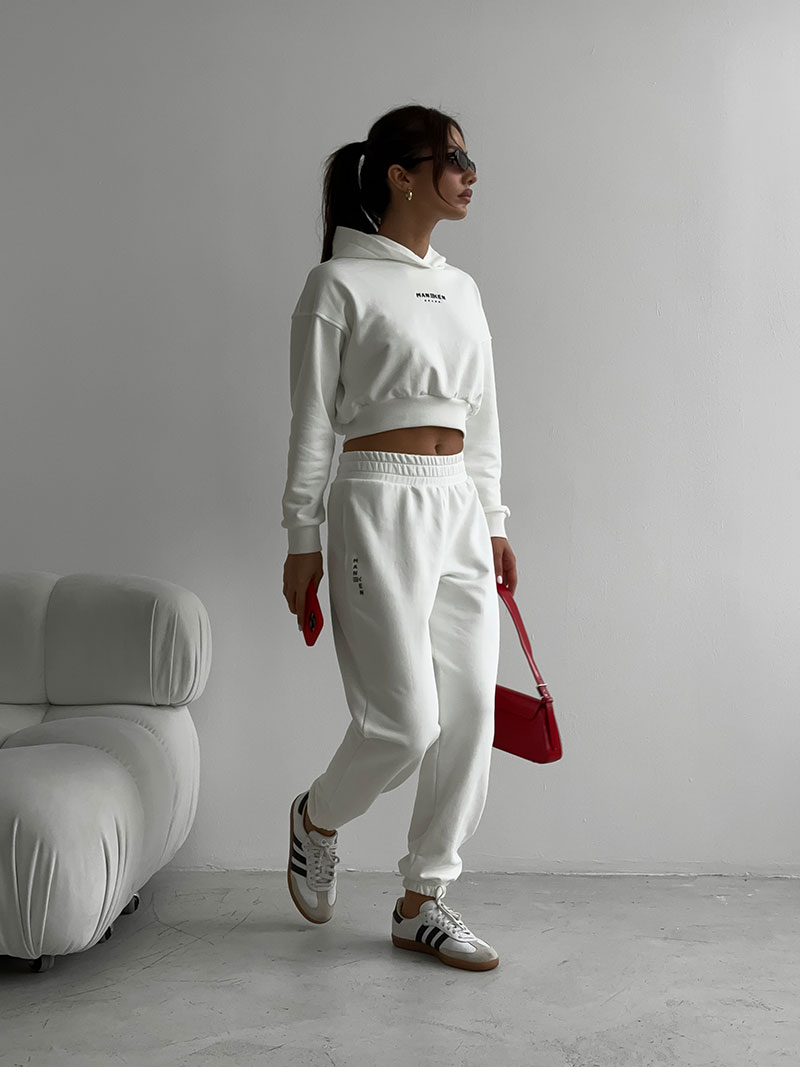 Фирменный укороченный костюм в молочном цвете с резиновым нанесением логотипа на груди.