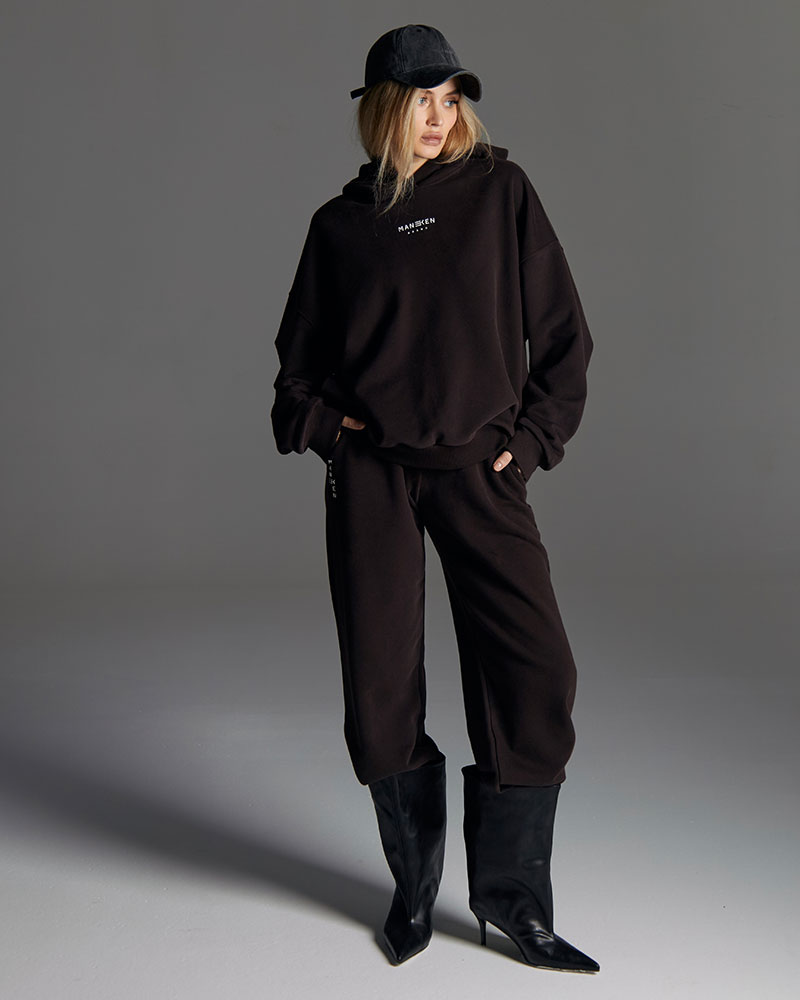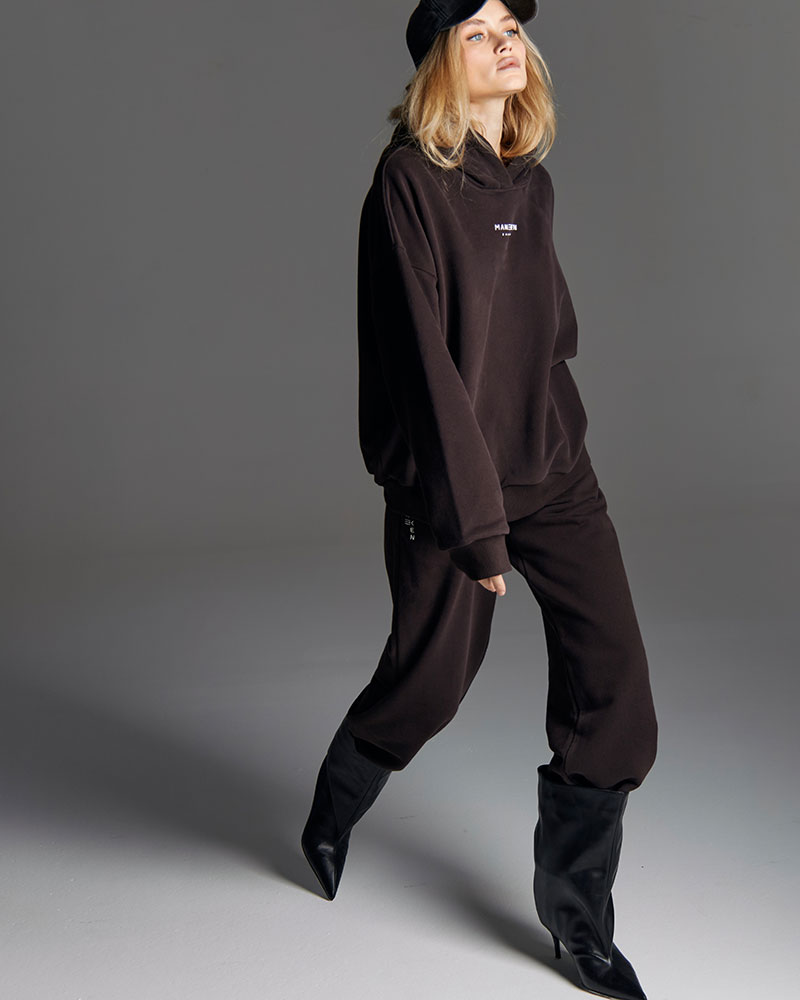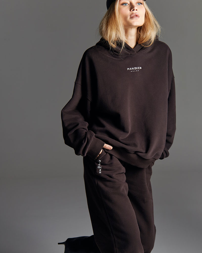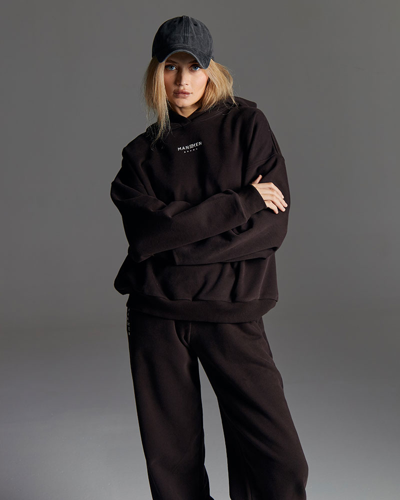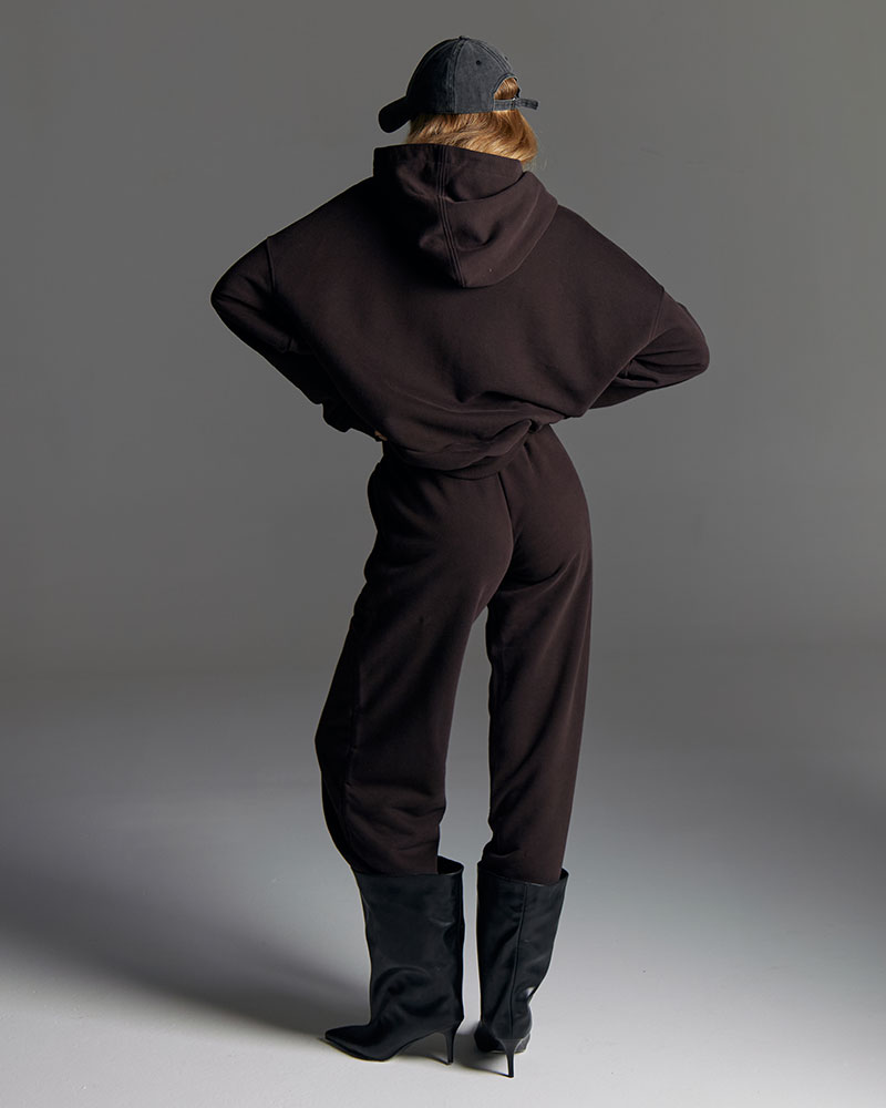 Минималистичный костюм состоящий из худи умеренного объема со спущенным рукавом и с лаконичным фирменным прорезиненным логотипом.