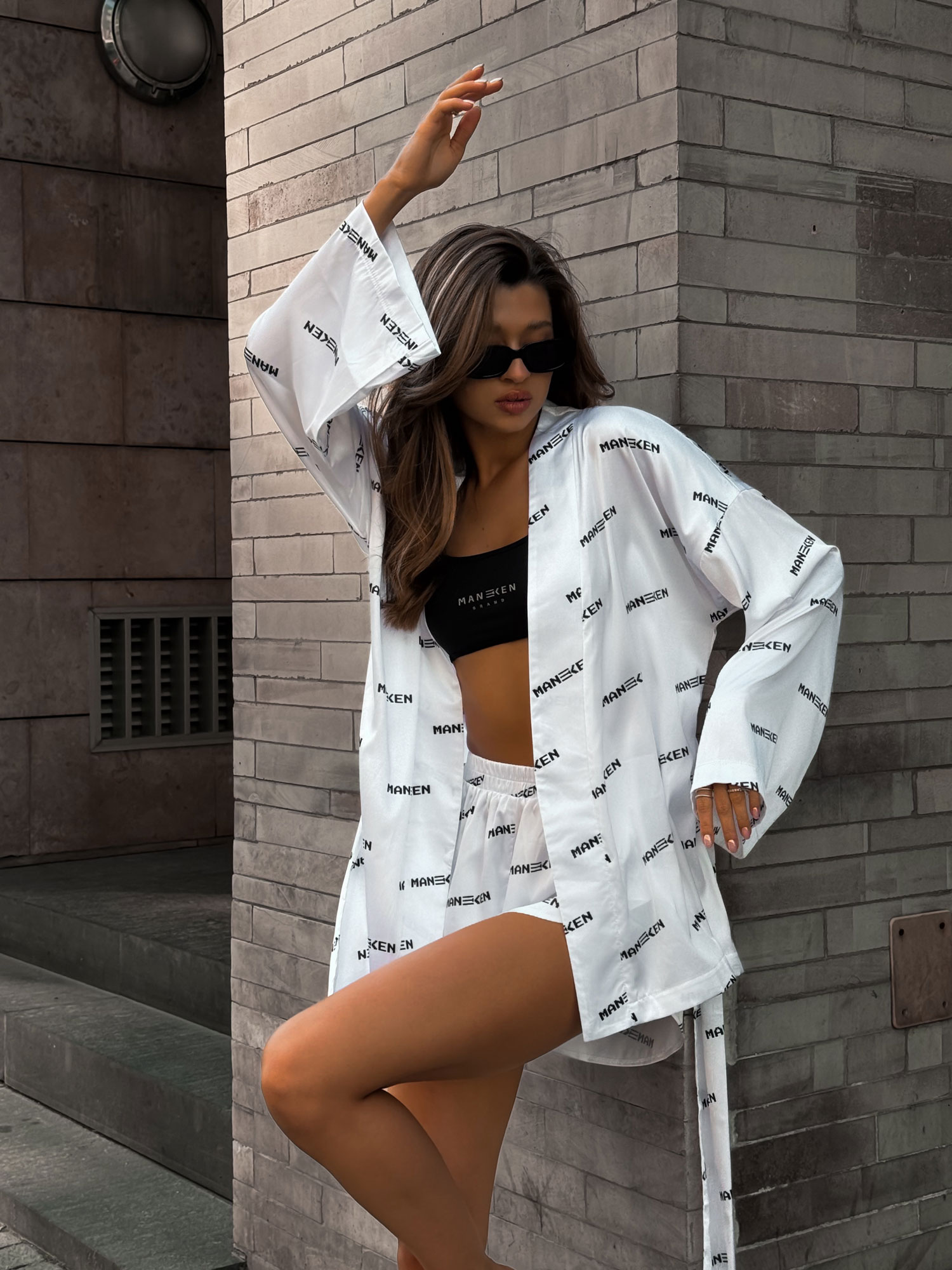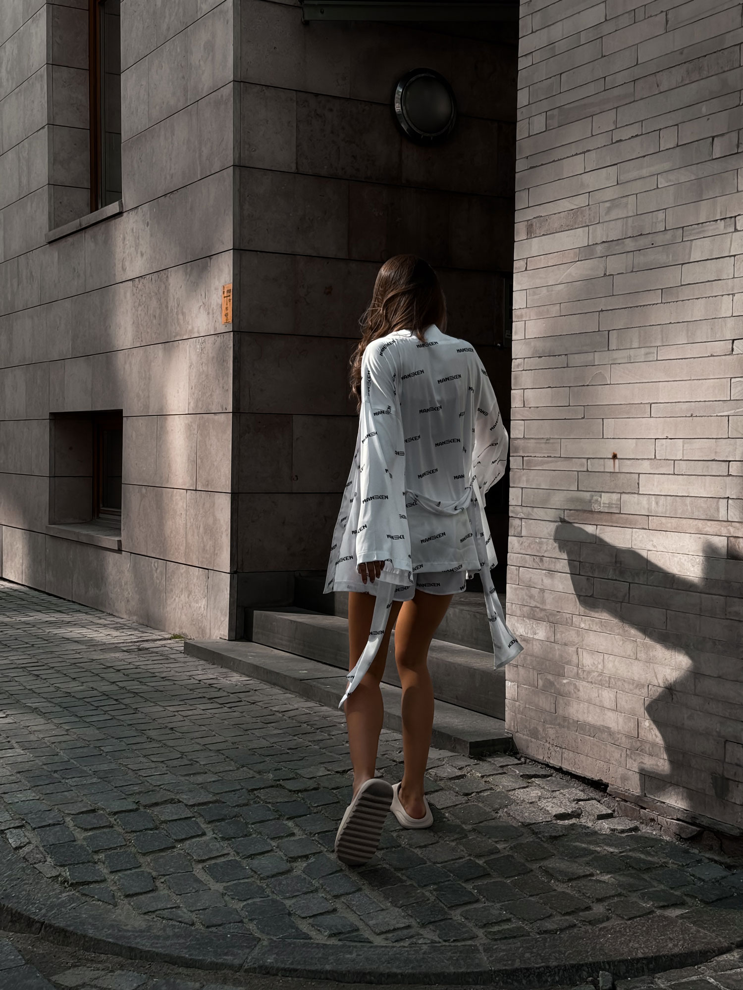 Брендированный костюм из шелка, скользящий по коже, с принтом “Maneken” с эффектом градиента, с переливами на солнце.