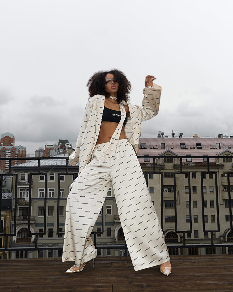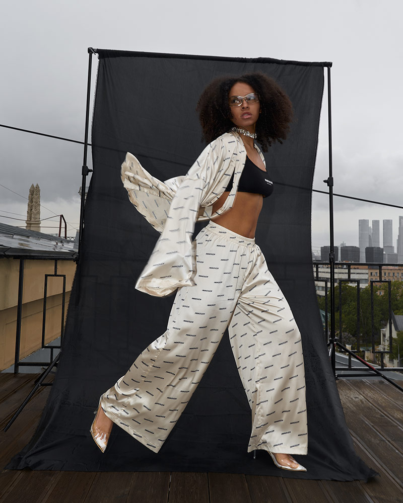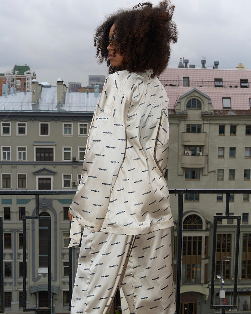 Костюм выполнен из высококачественного искусственного шелка, который обладает тактильными и визуальными качествами: