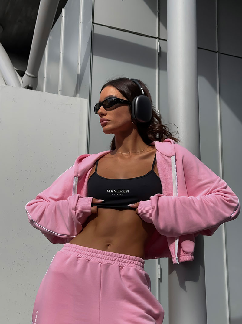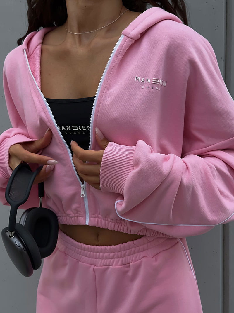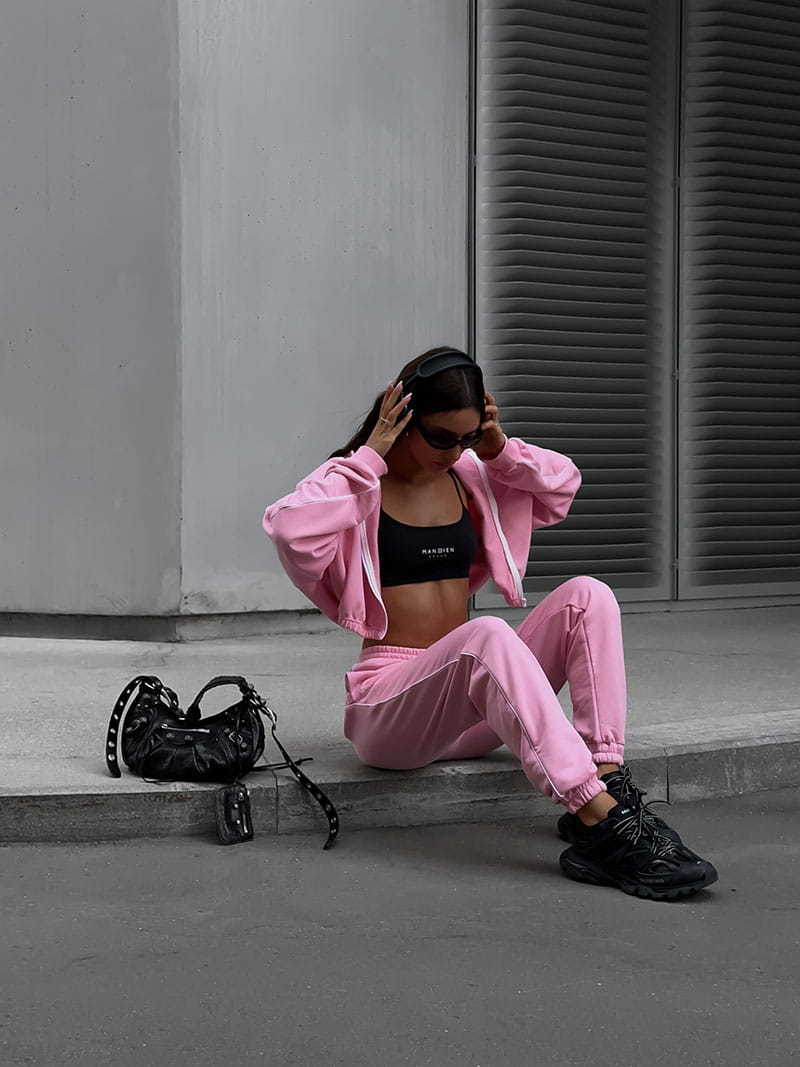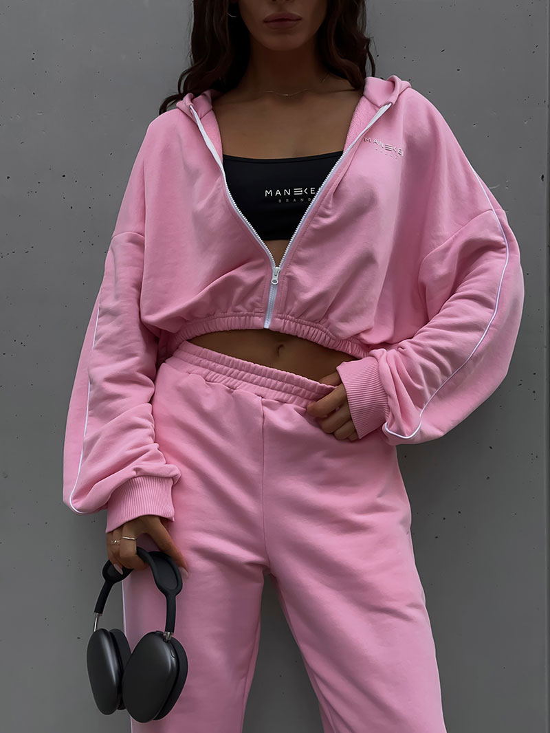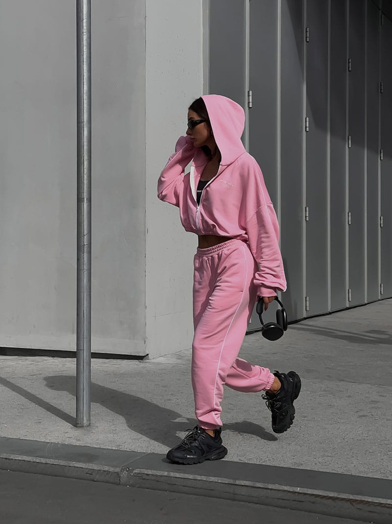 Кроп худи с зип молнией. Свободные джоггеры со сборкой и задним карманом на высокой посадке.