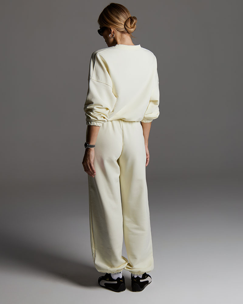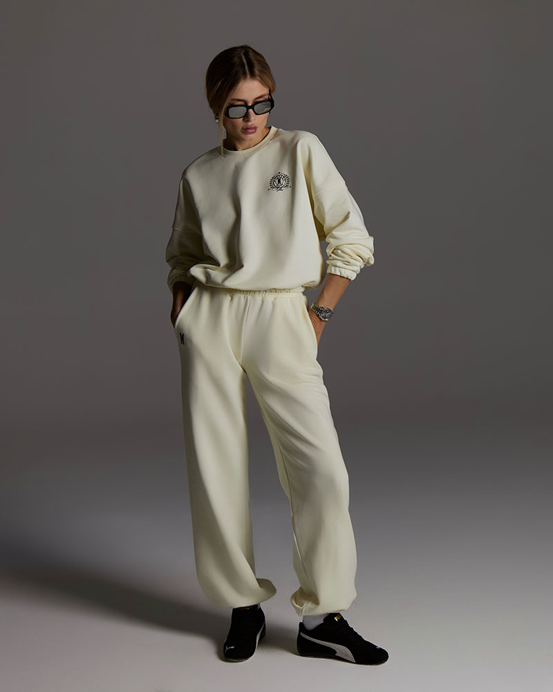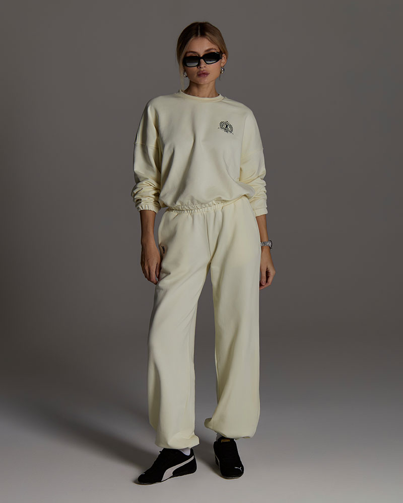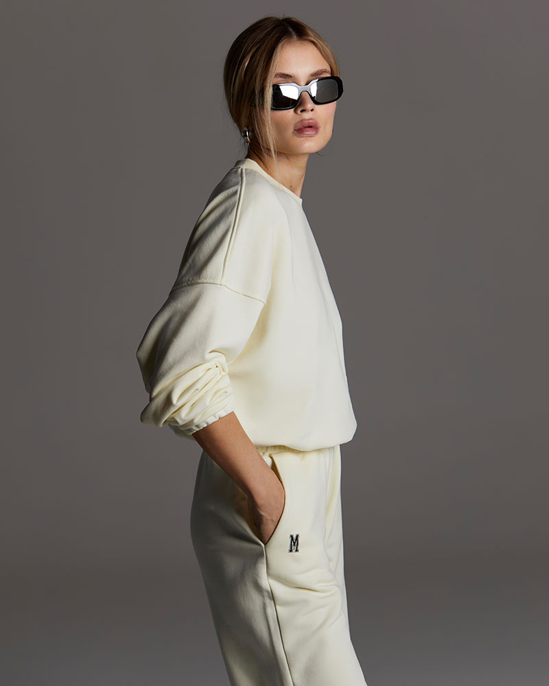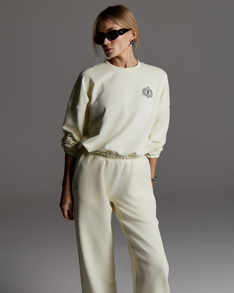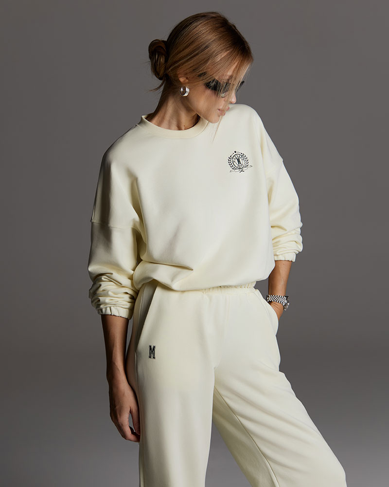 Свитшот умеренного объёма со спущенным рукавом. Мягкий oversize создаётся за счёт узкой нерегулируемой резинки по низу изделия и рукавам. Сбоку имеется принт «герб» в стиле old money.