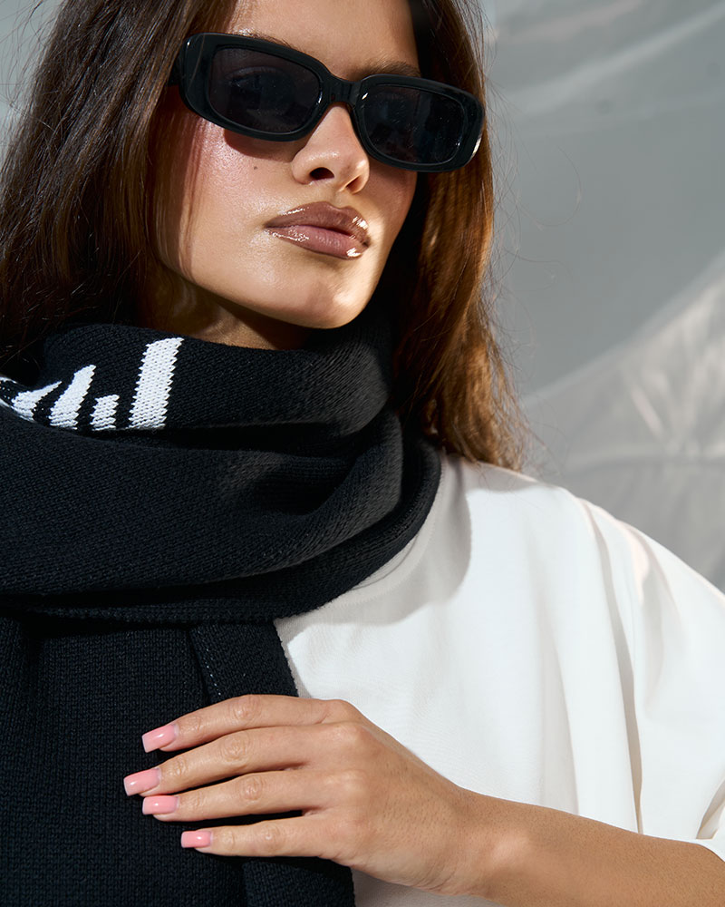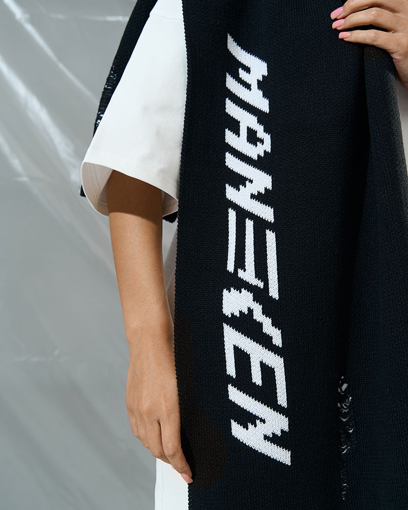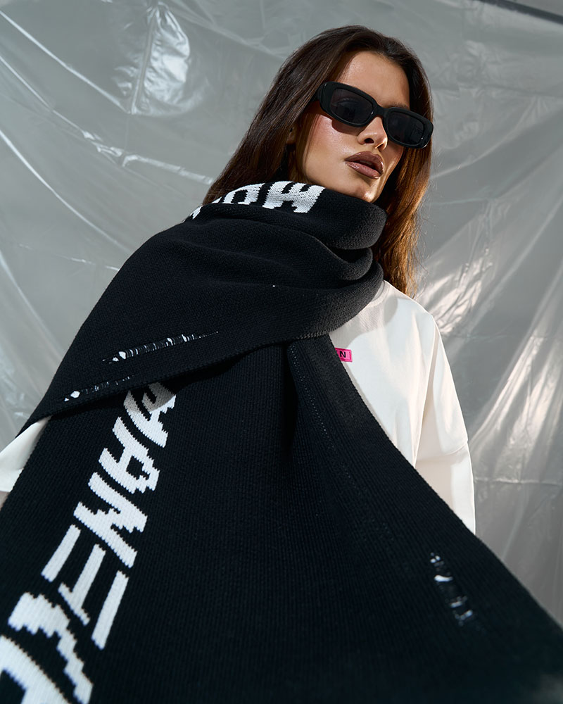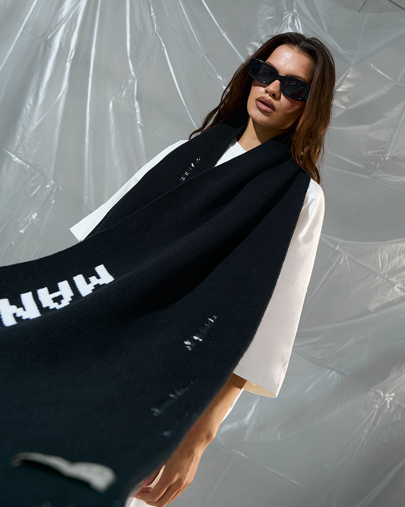 Широкий шарф с гранж эффектом по краям и эффектом распускания по всему шарфу. Длина аксессуара, чтобы пару раз обернуть вокруг шеи или сформировать на плечах объемную драпировку. По краям расположен логотип "в движении".