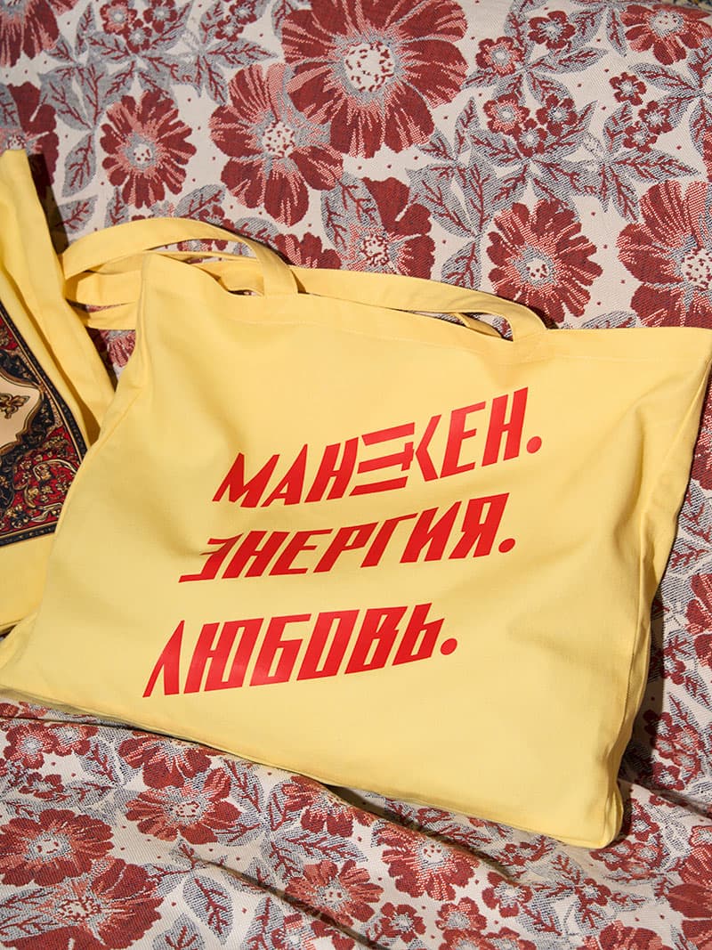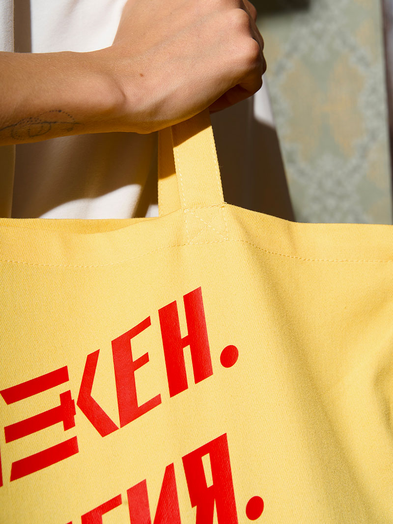 Яркий принт с девизом нашей компании, выполненный в стиле лозунгов советского Союза, придаёт сумке особую атмосферу.