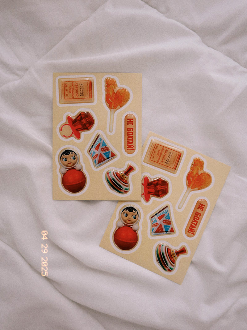 Стикеры представляли собой небольшие картинки с изображениями популярных персонажей, советской символики или же юмористическими надписями.