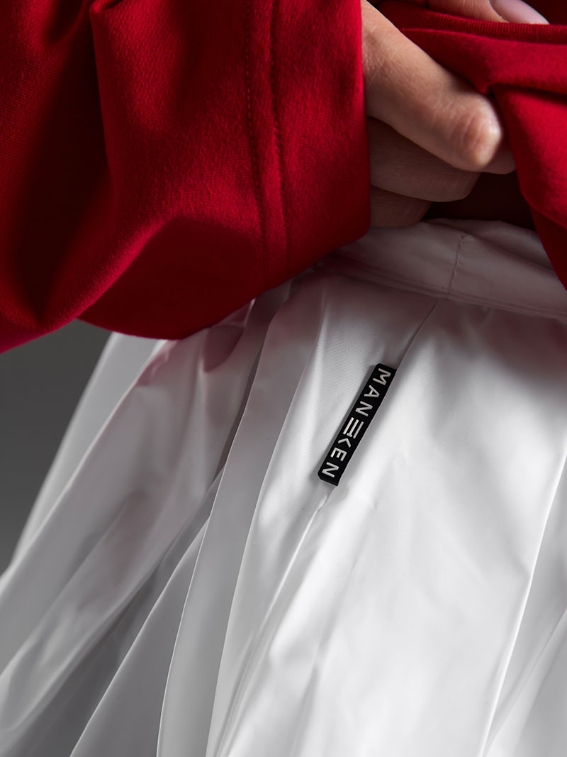 По линии талии застрочены встречные складки, дополнительно подчеркивающие фигуру. В боковом шве имеется резиновый шеврон с логотипом.