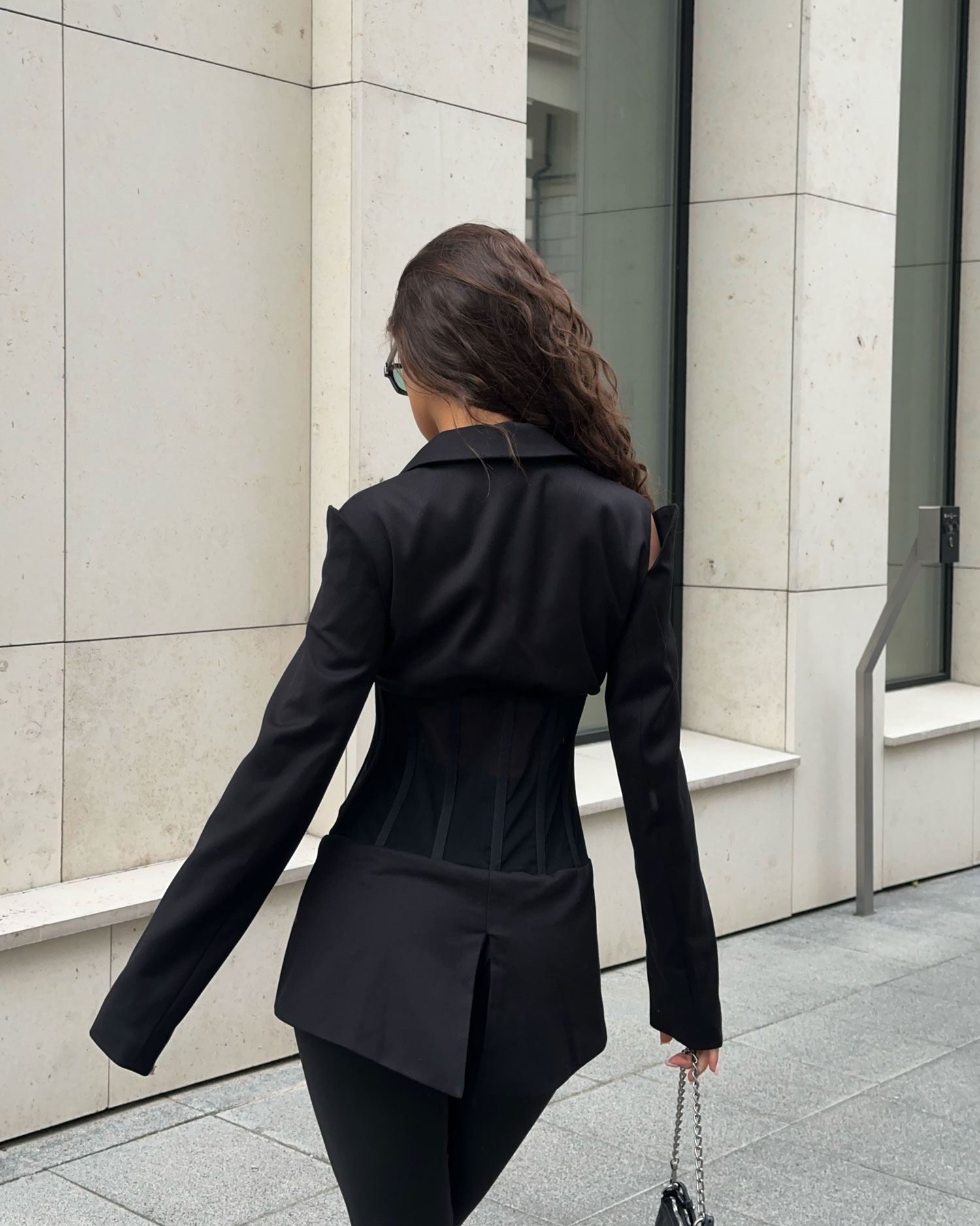 Жакет приталенного силуэта с глубоким декольте, корсетной частью по линии талии, выполненной из сетки. Застёжка на тракторную разъёмную молнию с брендированным пуллером в виде пиксельной буквы «М». Корсетная часть из сетки со спицами, создаёт утончённый силуэт стройной талии. Спинка с фигурным низом изделия имитирует женский фрак.